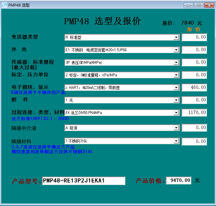 PMP46和PMP48是PMP41加装焊接密封隔膜结构而形成的延伸产 品,PMP46/PMP48的测量精度为±0.3%FS。除温度影响指标不同外,其它电气性能和技术参数与PMP41、PMP45基本相同。PMP46为 内螺纹锁母压旋式和Triclamp接口式结构。PMP48包含外螺纹连接、平法兰连接以及延伸平法兰连接等各种过程连接形式