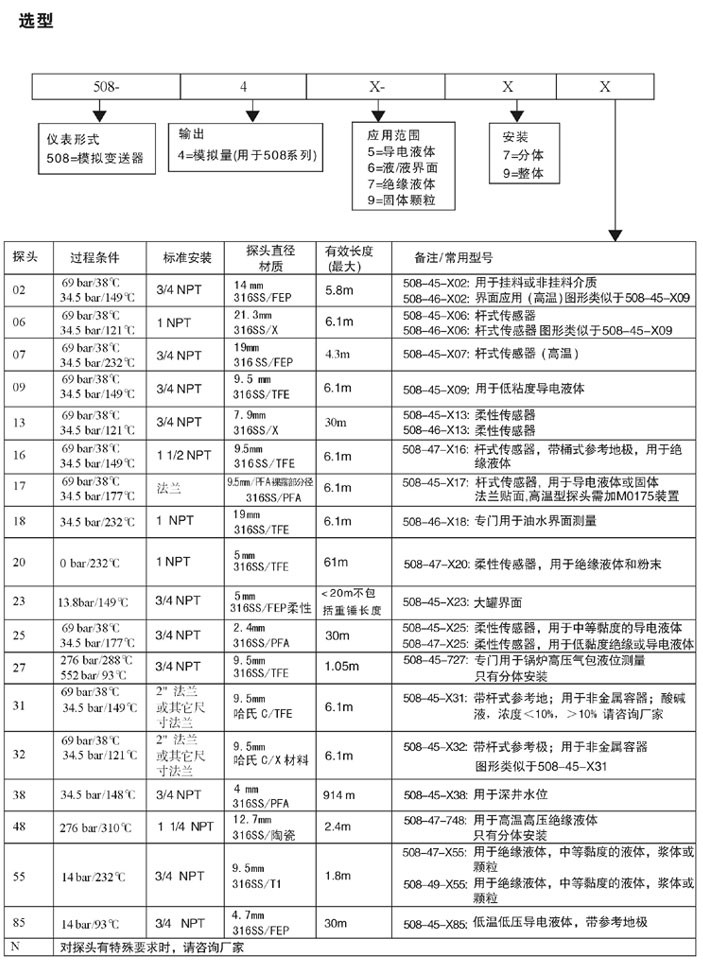 508系列通用射频导纳连续物位仪表,产品适用于大多数应用场合的连续测量。仪表**用于工业和民用现场,无论室内和户外,本仪表相对其他形式仪表,对现场安装条件均无特别要求。仪表由一个电路单元,一套防爆外壳和杆式或缆式传感器组成,传感器可选多种材质,可整体或分体式安装。